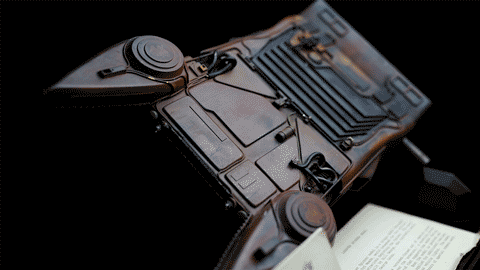 This model miniature is constructed from vacuum-formed plastic built over a plate armature with a hole for rod insertion and a gray rubber wire. During production, it was repainted from its original taxi yellow to brown to be rephotographed as different vehicles. Like other models, the Spinner was also applied with white tape to generate holdout mattes for VFX compositing work. As a result, this model's original decals were removed during production, though its original yellow taxi paint still shows through in some areas.